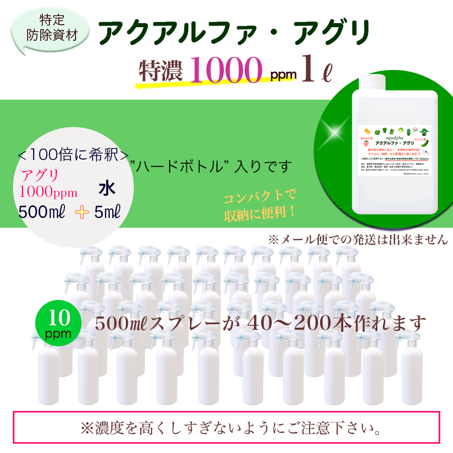 商品説明 名 称 アクアルファ・アグリ(特定防除資材) 1000ppm 成 分 微酸性次亜塩素酸水(純水、塩化カリウム・電解製法) ph6.4~6.51000ppm原液 内容量 1000ppm原液-1L 用途・使用法 農作物・園芸果実・植物・盆栽の ウイルス、細菌、カビ菌、バクテリアへの防除 保存方法 直射日光を避け、密封して保存してください。 配送方法 ※ポスト投函便での発送はできません。 ※決済方法で代金引換をご選択された場合は、別途代引き手数料がかかります。 同梱について ※「同梱可能」な送料無料の商品と同梱出来ますが、10L,20L商品との同梱はできません。 ※北海道、沖縄、離島は、10日程度かかりますので日にち指定はできません。また「3980円以上で送料無料」の対象にもなりませんのでご注意下さい。 販売者 広告文責:(株)アバリス 電話番号:0859-53-3953メーカー名:(株)アバリス 原産国:日本 商品区分:除菌、除菌スプレーアクアルファ・アグリ 農業用 次亜塩素酸水・ 1000ppm ------------------------------------------------- 農林水産省で特定農薬として指定されている材料・製法で製造しております 通常製品アクアルファ・ナノフォルテ同様、安全で高純度の品質となっており、野菜や植物等のウイルス等に、より安心してお使いいただけます。 次亜塩素酸水を使用した 減農薬・有機農業! 独自システムの最先端電解除菌水! 野菜や果物、植物などの病害防除! アクアルファ・アグリ ◆特定農薬(特定防除資材)は「有機栽培で使用する農薬の代替品」の法律上の名称で、 オーガニック農法でもちいることが認められているほど安全な物質です。 ◆特定農薬としての次亜塩素酸水の製法ついて 次亜塩素酸水にはいくつか製造方法がありますが、特定農薬として認められているのは、「塩酸または塩化カリウム水溶液を電気分解して得られた物」に限られており、同じ電気分解方式でも「塩(塩化ナトリウム)」を原材料にしたものは認められておりません。 また次亜塩素酸ナトリウムを希塩酸で希釈してつくる混合方式も禁止となっています。 ◆農林水産省、環境省が 特定農薬として指定 塩酸または塩化カリウム水溶液を電気分解して得られた電解次亜塩素酸水 1,検討対象の情報 塩化カリウム又は塩酸と飲用適の水を用いて生成された電解次亜塩素酸水であ って、pH 6.5 以下、有効塩素濃度 10~60 mg/kg(ppm) のもの 2,用途 きゅうり、いちご等の農作物や植物の病害防除を目的とする いちごのうどん粉病、きゅうりの灰色かび病、大葉などのさび病、バラの松の盆栽 春蘭、等 ◆アクアルファ・アグリ の特徴 ・残留毒性はありませんので、結実した果実や野菜に施されても問題ありません。 ・植物や果実・野菜に対する負荷をかけず、土壌に対しても悪害はありません。 ・そのまま採って食べることができます。そのまま出荷できます。 ・短時間でウイルス、細菌、カビ菌、バクテリア、の殺菌ができますが、逆に、農薬のように長期間の残留毒性効果がありませんので、 植物や病害虫によっては、農薬よりも頻繁に水やり感覚でご使用ください。 ・他の農薬と併用されても問題ありませんが、強酸性の薬剤との併用はお控えください。 ・アクアルファ・アグリは、高い消臭作用もありますので、植物によっては花の香りを抑える場合もあります。 ◆その他 ・農薬によるの健康被害を軽減させることができる ・水やり感覚で簡単に散布できるため農作業効率が上がる ・取り扱いが簡単なため手袋やゴーグルなどが不必要 ・各々の作物で農薬を使い分ける必要がない ・農作物や植物はもちろんのこと、土壌や河川、海水、自然環境に負荷をかけない ・盆栽やプランター栽培の果実植物や鑑賞花木等にも水やり感覚で施すことにより病害の原因のウイルスや細菌、病害虫を防ぐことができる ・農作物だけでなく、園芸栽培場、家畜の飼育場等へのウイルス、細菌類の侵入に対して縁を絶つことが可能なため、口蹄疫や鳥インフルエンザ等の感染や蔓延を防ぐ効果も期待される(鳥インフルエンザを早めに予防することは非常に有効な手段です) ・次亜塩素酸水は人にも鳥にも安全に扱うことができ、実証実験でも効果があることが立証されています。 ・ウイルス、細菌、カビ菌、バクテリアには、高い殺菌力があります。また、ダニ、線虫、昆虫といった小動物に対しては忌避効果があるため、例えば、松の木に施すことにより、マツノマダラカミキリが寄り付 かなくなれば、線虫を媒介する昆虫が来なくなるため松枯れを防ぐことも可能となります。 ・農薬散布による人体や動物、自然環境、昆虫の生態系への影響をなくすことができ、また、農薬散布のコストを大きく抑えることもできる。 成分:微酸性次亜塩素酸水 ph6.4~6.5 /(純水、塩化カリウム・電解製法) 主な用途:農作物・園芸果実・植物・盆栽 の除菌や病害防除など 注意: ・密封の上冷暗所に保管して下さい ・口に含んでも害はありませんが飲料水ではありません ・お子様の手の届かないところで保管して