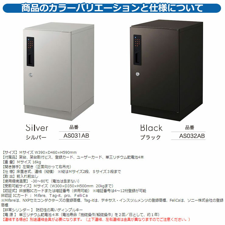 郵便ポスト 郵便受け イーディーキューブ ed-CUBE(Mサイズ) IC カードや暗証番号を鍵として使用することが可能! 販売条件 ◆詳しくはこちらをご確認ください カラー ・1ABシルバー ・2ABブラック サイズ W390×D460×H590mm 重量:16kg/受取可能サイズ:Mサイズ(W300×D350×H500mm 20kgまで) 仕様 宅配ボックス/付属品:架台 架台取付ビス 登録カード ユーザーカード 単三リチウム乾電池4本/左開き(正面向かって右吊元)、前入れ前出し/連結する場合:別途連結金具が必要になります 材質 詳細をご確認下さい/オプション品別売 セット内容 ■イーディーキューブ ed-CUBE(Mサイズ) 品番:AS03□ ※□にはカラー品番が入ります。※ご購入時に選択いただいたお色の商品1点をお送りいたします。 備考・注意 ※配送には、実働約7~10日程度お時間が必要となる場合があります。欠品時はさらにお時間がかかります。 ※イメージ画像はイメージサンプルとして販売内容以外の商品があります。必ず内容を確認ください。 ※イメージ画像は使用するモニターやブラウザにより色が違って見える場合があります。 ※施工には、専門的な知識と、道具、技能が必要となります。お近くの工事店にご依頼して頂くようお願い致します。 分類 【セキスイ】【SEKISUI】【郵便ポスト・郵便受け】【宅配ボックス】セキスイ 宅配ボックス イーディーキューブ ed-CUBE シリーズ 宅配便の荷物をいつでも受け取りを可能とする戸建・賃貸住宅用 宅配ボックス「ed-CUBE(イーディーキューブ)」 ed-CUBEは、非接触 IC カードや暗証番号を宅配ボックスの鍵として使用することができ、一般のダイヤル式宅配ボックスと違い高いセキュリティが確保できる製品です。宅配ボックスを玄関先に設置すれば、不在時でも指定時間を気にすることなく配達物が受け取れ、通販等も利用しやすくなります。突然の訪問で手が離せない時や夜間の受け渡し対策としても有効です。 戸建玄関ドア用電気錠(当社製)や賃貸住宅玄関ドア用電気錠「ed ロック PLUS(イーディーロック プラス)」と併せて設置することにより、入居者は住戸の鍵である IC カードや暗証番号を宅配ボックスの鍵として使用することができ、入居者は複数の鍵を持つ煩わしさがありません。また、宅配業者は荷物を預け入れる際も面倒な操作がなく、スムーズな預入が可能です。 ▼ セキスイ 宅配ボックス イーディーキューブ ed-CUBE シリーズ 購入はこちら ▼ ▼ 宅配ボックス 購入はこちら ▼ ▼ 適合オプション品 購入はこちら ▼ ▲(Mサイズ) ▲(Sサイズ)特注 ▲上下連結金具セット ▲横連結ビスセット