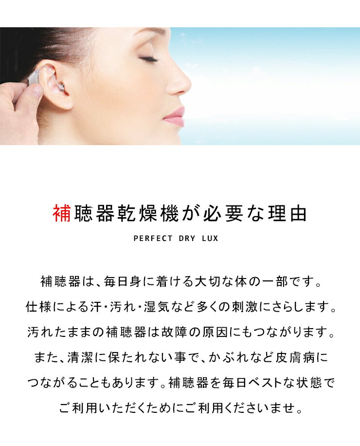 当該商品は自社通販他サイトの在庫と共有しているため、タイミングにより在庫切れの場合やむをえずキャンセルさせていただく可能性があります。 【サングラスドッグってどんなお店?】 サングラスドッグは スポーツサングラス・ブランド サングラス・メガネ(眼鏡)・カラコン(カラーコンタクト)・帽子の通販サイトです。 2005年より販売を開店させて頂き、今ではお客様のおかげさまで.楽天ランキング入賞 ・楽天最安値に挑戦のアイテムが多数ございます。 簡易的ではありますが、母の日 父の日 誕生日 結婚記念日 還暦祝い などの・プレゼント ・ギフトなどのギフト包装にも対応しております。 イベント特集や、スーパーアウトレット、試着のお試しや、訳あり、懸賞など他にも当店で人気・おすすめのサービスやイベントも多数ございますので是非遊びに来て下さいね♪シーメンス シグニア 補聴器用乾燥機 パーフェクトドライ ラックス 外寸 横・奥行き・高さ(mm):93×76×48 内寸(乾燥室) 横・奥行き・高さ(mm):70×51×21 重量 144g UVランプ波長 253.7nm 供給電圧 5V DC