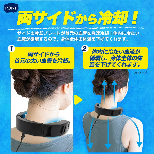 . ペルチェ素子で首元を急速冷却!身体全体を冷やす! ポータブルネッククーラー ■首元を急速冷却!身体全体を冷やす! サイドの冷却プレートが首元の血管を急速冷却!体内に冷たい血液が循環するので、身体全体の体温を下げてくれます。 ビジネスやアウトドア、スポーツ観戦や釣りなど幅広く活躍します。 ■-16℃の強力冷却! 他社製品は5W出力が多いですが、本製品は10Wの高出力設計! 外気温から-16℃(体感温度)の強力冷却を実現しました。 ■小型冷蔵庫にも使用されるペルチェ素子採用! 小型冷蔵庫にも使用されている「ペルチェ素子」を採用。電流を流すと、片面が冷却、反対面には発熱が起こる現象を利用して身体を冷やします。 ■外気温に影響されない直接冷却! 周囲の風で冷やすファン冷却とは違い、ペルチェ素子による直接冷却なので、気温が高い時でも確実に首元を冷やすことができます。 ■サイズ調整可能!大人から子供まで対応! アジャスタで首周りサイズを調整可能です。また、アタッチメントも付いているので、首元の調整も可能です。 ■すぐに冷える! スイッチを入れると数秒で冷たくなります! 製品仕様 サイズ(約) 外寸:最小(約)縦141×横136mm 最大(約)縦164×横179mm 内寸:最小(約)縦115×横87mm最大(約)縦140×横120mm 重量(約) 190g 出入力 5V 2.2A モード 強モード/弱モード プレート温度 外気温より-10℃〜−16℃ 稼働時間(約) 強モード:3時間/弱モード:5時間 ※10000mAhバッテリー使用 付属品 Type-Cケーブル・説明書・プレート用アタッチメント 注意 ※バッテリー・アダプタは付属しません。 ※5V 2.4A以上の出力に対応したバッテリー・アダプタを使用してください。 ※冷やしすぎに注意してください。冷えすぎる場合は冷却プレートにタオル等を挟むなどしてご使用ください。 ※ファンを塞がないでください。 ※ペルチェ素子の特性上、使用後は冷却プレートが温かくなります。ペルチェ素子で首元を急速冷却!身体全体を冷やす! ポータブルネッククーラー ■首元を急速冷却!身体全体を冷やす! サイドの冷却プレートが首元の血管を急速冷却!体内に冷たい血液が循環するので、身体全体の体温を下げてくれます。 ビジネスやアウトドア、スポーツ観戦や釣りなど幅広く活躍します。 ■-16℃の強力冷却! 他社製品は5W出力が多いですが、本製品は10Wの高出力設計! 外気温から-16℃(体感温度)の強力冷却を実現しました。 ■小型冷蔵庫にも使用されるペルチェ素子採用! 小型冷蔵庫にも使用されている「ペルチェ素子」を採用。電流を流すと、片面が冷却、反対面には発熱が起こる現象を利用して身体を冷やします。 ■外気温に影響されない直接冷却! 周囲の風で冷やすファン冷却とは違い、ペルチェ素子による直接冷却なので、気温が高い時でも確実に首元を冷やすことができます。 ■サイズ調整可能!大人から子供まで対応! アジャスタで首周りサイズを調整可能です。また、アタッチメントも付いているので、首元の調整も可能です。 ■すぐに冷える! スイッチを入れると数秒で冷たくなります! 製品仕様 サイズ(約) 外寸:最小(約)縦141×横136mm 最大(約)縦164×横179mm 内寸:最小(約)縦115×横87mm最大(約)縦140×横120mm 重量(約) 190g 出入力 5V 2.2A モード 強モード/弱モード プレート温度 外気温より-10℃~-16℃ 稼働時間(約) 強モード:3時間/弱モード:5時間 ※10000mAhバッテリー使用 付属品 Type-Cケーブル・説明書・プレート用アタッチメント 注意 ※バッテリー・アダプタは付属しません。 ※5V 2.4A以上の出力に対応したバッテリー・アダプタを使用してください。 ※冷やしすぎに注意してください。冷えすぎる場合は冷却プレートにタオル等を挟むなどしてご使用ください。 ※ファンを塞がないでください。 ※ペルチェ素子の特性上、使用後は冷却プレートが温かくなります。
