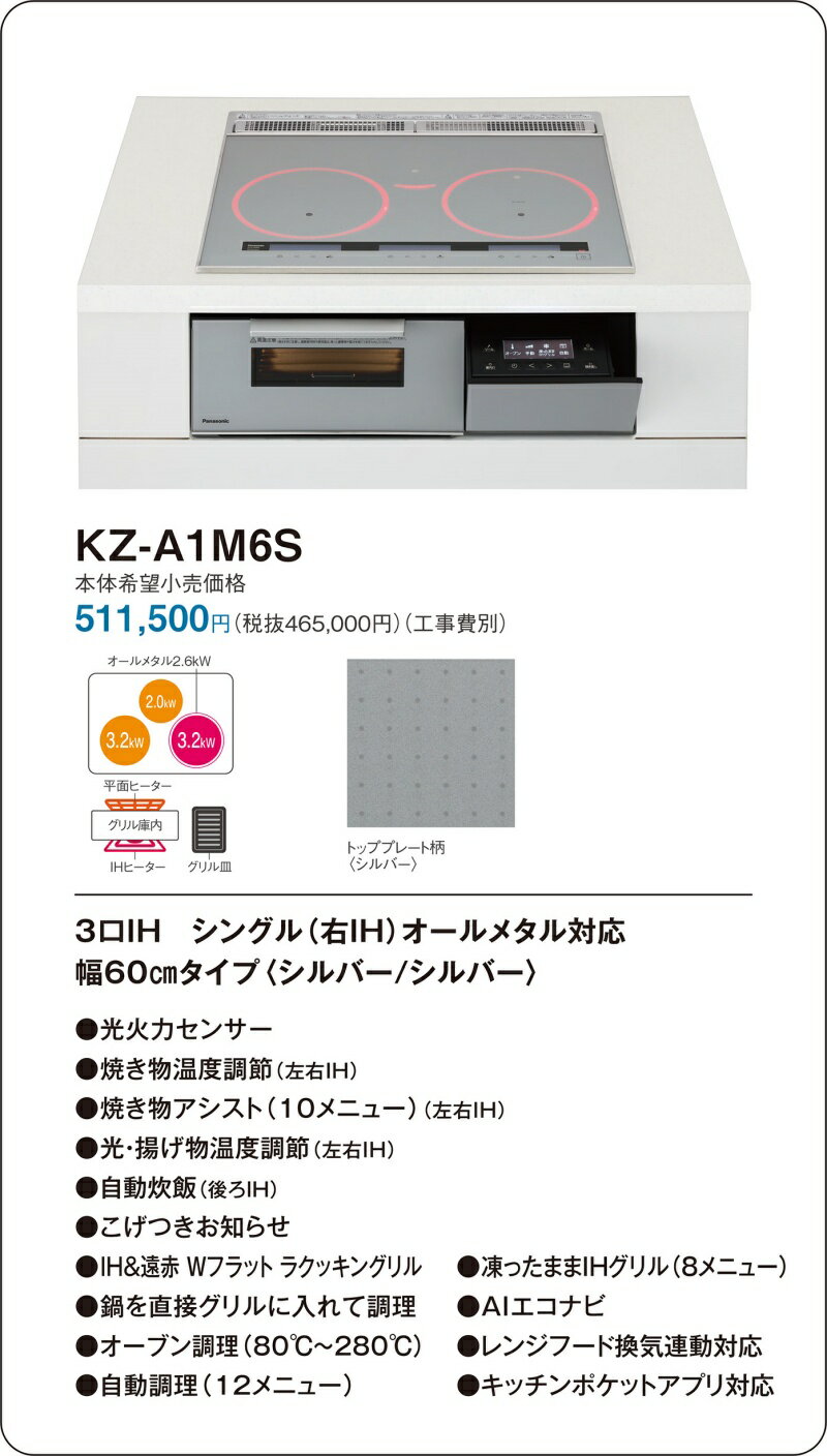 [法人限定] KZ-A1M6S パナソニック IHクッキングヒーター ビルトイン シルバー/シルバー 60cm 3口IH シングル(右IH)オールメタル対応 [ KZA1M6S ]