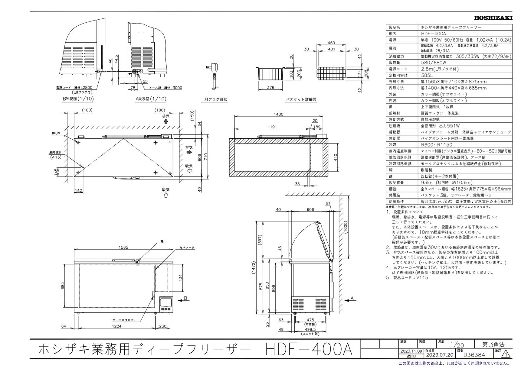 ■商品説明■-60度の超低温で保存することでタンパク質の酵素分解や脂肪の酸化を抑制、 さらに、冷凍焼けによる変色や食感の悪化も防ぎます。商品名:HDF-400A ホシザキ ディープフリーザー 385Lメーカー:ホシザキメーカー品番:HDF-400Aお届け数:1外形寸法:幅1565×奥行710×高さ875(mm)内径寸法:幅1400×奥行440×高さ685(mm)電源:単相100V 50/60Hz 1.02kVA(10.2A)消費電力:305/335W定格内容積:385L製品質量:93kg(梱包時 約103kg)庫内温度制御:マイコン制御(デジタル温度表示) -60~-50度調節可能扉形式:上下開閉式 1枚扉付属品:バスケット3個、セパレーター、霜取り用ヘラ、キー2本電源コード:2.8m(L形プラグ付き)商品について【配送料について】この商品は、全国配送料金無料にてお届け致します。※北海道・沖縄・離島や一部地域では追加配送料が発生致します。【ご注意】画面上の色はブラウザやご使用のパソコンの設定により実物と異なる場合があります。