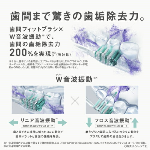↑↑↑正確な在庫状況は上記バナー「在庫状況を確認する」をクリックして頂き、必ずご確認ください。 長期保証をご希望のお客様は下記の表より「商品+長期保証」のページへ移動してご注文ください。※長期保証は法人加入や業務使用、譲渡や再販はご利用いただけません。 ■W音波振動(※音波領域内での、ヨコ約31000、タタキ約20000ブラシストローク/分の振動※)で、歯間まで驚きの歯垢除去力■「歯間フィットブラシ」×「W音波振動」で歯間の歯垢除去率が200%(※当社基準による歯間部人工プラーク除去率比較。EW-DT88 W-CLEANモードレベル3と、極細毛ブラシコンパクト×W音波振動(W-CLEANモード時)EW-DT63との比較。実際の口内での効果は異なる場合があります。※)にアップ■約3日で歯ぐきの健康を推進(※当社基準による評価※)■押し付け防止センサー(音でお知らせ)EWDP58P本体寸法:約 高さ23.3×幅2.4×奥行2.6cm(ブラシ含む)本体質量:約95g(ブラシ含む)振動方式:W音波振動振動数:ヨコ:毎分約31,000ブラシストローク、タタキ:毎分約20,000ブラシストロークモード:Wクリーンモード、Wガムモード、クリーンモード、センシティブモード機能:■防水設計 IPX7(※本体はIPX7基準(水深1メートルに30分間水に浸けても有害な影響を生じる量の水の侵入がない)検査をクリアしています。※) ■国内使用のみ(※ Bluetooth搭載に伴い、国内の電波法規のみ遵守した仕様となっているため、海外でのご利用はできません。※)AC100〜240V ■パワーコントロール ■コース記憶機能 ■充電残量表示付 ■充電催促機能 ■磨きポイント切替お知らせ ■ライトリング ■磨き角度センサー ■押しつけ防止センサー・プロ ■動かしすぎ検知 ■USB充電充電時間:フル充電:約7時間/6分間クイックチャージ:約2分定格電圧:AC100-240V 50-60Hz電池種類:リチウムイオン(Li-ion)電池消費電力:約1.5W(充電時)使用時間:フル充電時:Wクリーンモード・Wガムモード時 約11日間(約45分)、その他のモード時 約16日間(約66分)/6分クイックチャージ時:約2分付属品:歯間フィットブラシ、トータルケアブラシ、携帯ケース