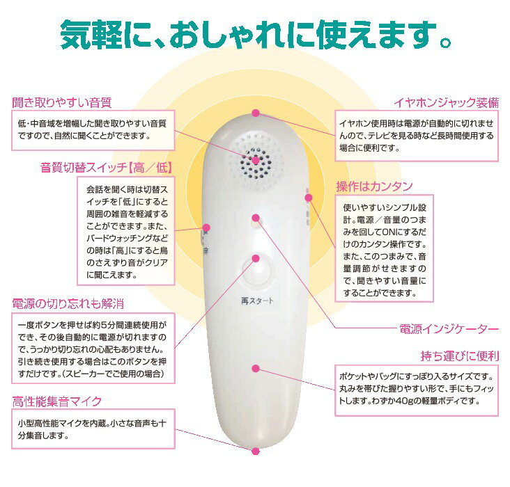 特長会話が聞きづらいときに、気軽におしゃれに使える 聞きたいときにさっと取り出して耳に当てるだけ。「高温/低温」と音量それぞれの調節ができ、周囲の雑音も軽減。 耳にフィットするイヤホンで会話も快適です。 会話だけでなく、テレビやラジオなどの音声も聞こえやすくなります。 コンパクトなサイズで、持ち運びにも便利。外出先でも使いやすいストラップ付です。 ●簡単操作 「電源/音量」のつまみをまわして電源ONにするだけ、音量調節も同じつまみでの簡単操作です。 音質切り替えスイッチ「高/低」で、会話を聞くときは「低」にすると周囲の雑音を軽減することができます。 また、バードウォッチングなどの時は「高」にすると、鳥のさえずり音がクリアに聞こえます。 ●持ち運びに便利 ポケットやバッグにすっぽり入るサイズ。 丸みを帯びた握りやすい形で手にもフィット。 約40gの軽量ボディ。 首から下げて携帯に便利なネックストラップ付です。 ●聞き取りやすい音質、イヤホンも使える 低・中音域を増幅した聞き取りやすい音質で、自然に聞くことができます。 イヤホンジャック装備およびイヤホン付属。 耳にフィットするイヤホンで会話も快適。 イヤホン使用時は電源は自動的に切れませんので、テレビを見るときなど長時間使用する場合には便利です。 ●こんな時に ・役所や銀行の窓口などで会話が聞きづらいときに ・医師や看護師、介護支援専門員など医療や介護の場面で ・お買い物のやり取り ・家族のだんらん ・講演会 型番 : VM-1 JAN : 4990567711470製品仕様サイズ : 約幅3.9×高さ12.3×奥行2.1cm 重量 : 約40g(電池含まず) 材質 : ABS樹脂