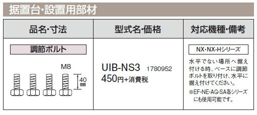 NX・NX-Hシリーズ用水平でない場所に据え付ける時、ベースに調整ボルトを取りつけ、水平に据え付けてください※個人宅への配送は別途送料が必要となる場合があります。また、北海道、沖縄、離島など、一部地域にはお届けできない場合がございます。あらかじめご了承ください。検索用カテゴリ638