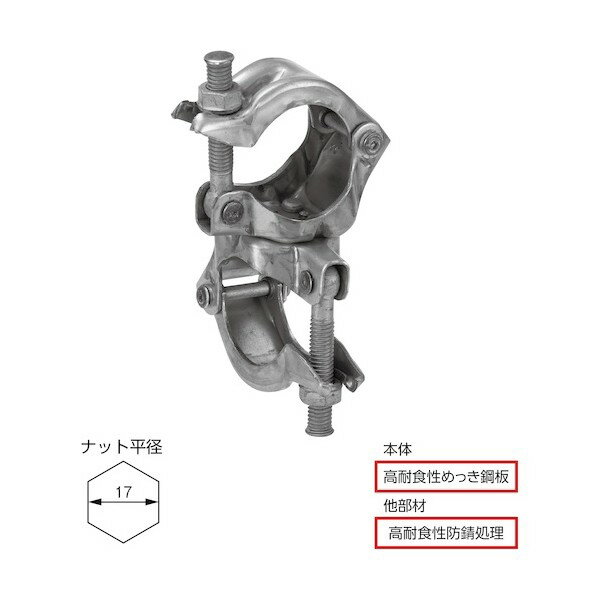 特徴 ■特徴 独自のナット抜け防止機構です。 全部品に高耐食性防錆処理が施されています。 ■用途 単管パイプ同士の緊結に。 ■仕様 (一社)仮設工業会認定品 ■材質 スチール 表面処理:溶融亜鉛メッキ ■注意点 ボルト締付トルク34.3N・m 仕様 入数 1点 1030141