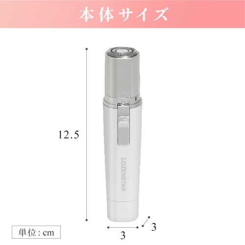 ロゼンスター ビューティープラスシェーバー 回転式 乾電池式 防水 WET剃り可 小型 スティックタイプ 自動研磨システム採用 ホワイト ABP132 【肌に優しい回転式&自動研磨システム】5つの回転刃が顔の凹凸にフィットし、肌に優しく深剃り。自動研磨システムが常に鋭い切れ味を保ち、長くご愛用いただけます。 【WET/DRY対応&水洗い可能】 乾電池式コードレスで場所を選ばず忙しい朝のドライ剃りも、お風呂での泡剃りもOK。防水設計で、使用後は水洗いできいつでも清潔に保てます。 【小型スティックタイプで持ち運び便利】 口紅のようなコンパクトなスティックデザインで、ポーチやバッグにすっきり収納。旅行や外出先での急なムダ毛ケアにも最適です。 【単3乾電池1本でパワフル稼働】 入手しやすい単3アルカリ乾電池1本で駆動するため、充電の手間なくどこでもすぐに使えます。いざという時も電池交換で対応でき、ストレスフリーです。 【商品仕様】◇本体サイズ:幅3×奥行3×高さ12.5cm ◇本体重量:51g ◇電源方式:単3型アルカリ電池1本使用(電池別売) ◇使用時間:1日1回(1回2分)として約1か月使用可能(アルカリ乾電池使用時) ◇保証期間:お買い上げ日より1年間(保証の範囲については、取扱説明書をご確認ください。(一般家庭用以外(業務用など)に使用された場合の故障及び損傷などは保証対象外となります)) ■お肌にやさしく、いつでもどこでも簡単ケア。 ■携帯に便利なスティックタイプ。 ■刃が直接触れないので、お肌にやさしく処理がで可能。 ■自動研磨システム採用で、剃りながら刃を研磨することで長期間切れ味を保てる。 ■生活防水仕様(IPX5相当)なので、水洗いで清潔。 商品コード62078876360商品名ロゼンスター ビューティープラスシェーバー 回転式 乾電池式 防水 WET剃り可 小型 スティックタイプ 自動研磨システム採用 ホワイト ABP132カラーホワイト※他モールでも併売しているため、タイミングによって在庫切れの可能性がございます。その際は、別途ご連絡させていただきます。※他モールでも併売しているため、タイミングによって在庫切れの可能性がございます。その際は、別途ご連絡させていただきます。