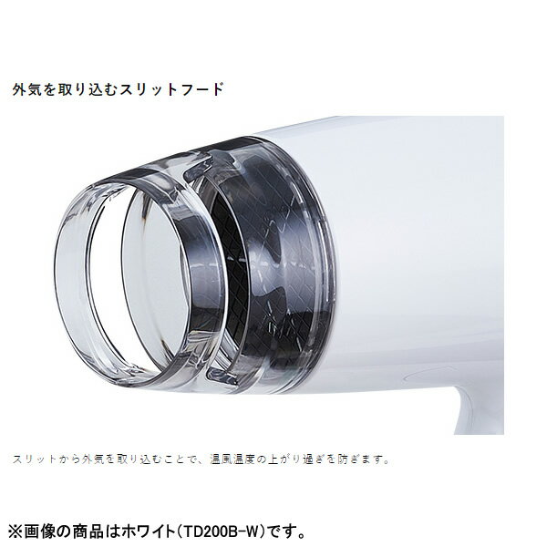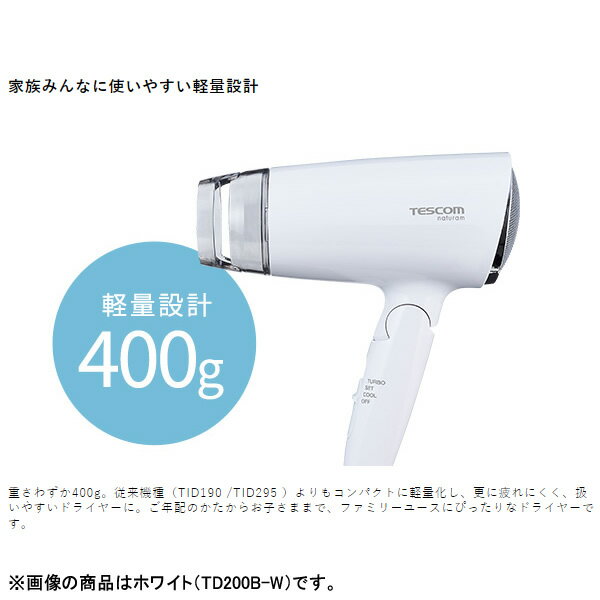 ■ テスコム ■すばやく乾かすシンプルなマイナスイオンヘアードライヤー◆ 主な特長 ◆◆ 主な仕様 ◆温風温度(約)110℃(周囲温度30℃の場合、TURBO使用時)風量(約)1.2m3/分(TURBO使用時)イオン機能○電源AC100V(50/60Hz)消費電力1200Wサイズ(約)本体のみ:幅14.8×奥行7.7×高さ20.6cmフード付き:幅18.2×奥行7.7×高さ20.6cm質量(約)本体のみ:385gフード付き:400g電源コード長さ(約)1.7m付属品スリットフード
