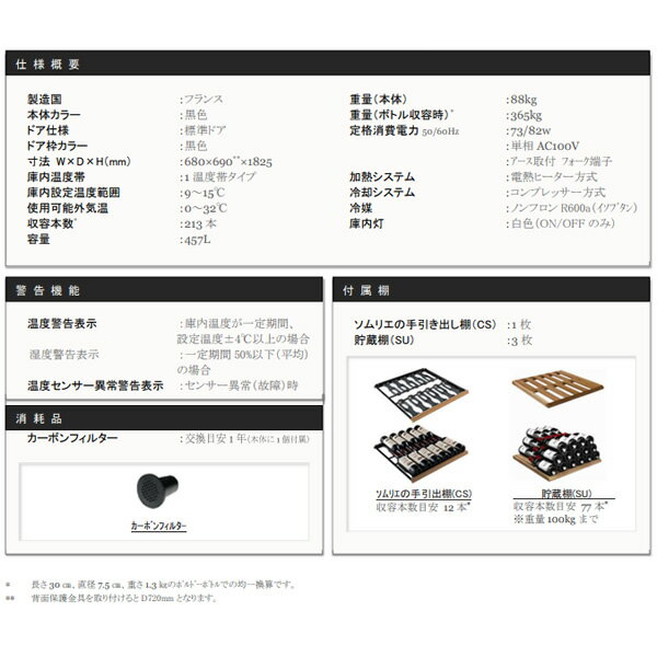 ■ EUROCAVE (ユーロカーブ) ■◆ 主な特長 ◆シンプルながらエキスパートなワインセラー●繊細な白色ライト庫内ライトを搭載しており、他のシリーズと異なる白くクリアな光はよりスタイリッシュに棚に並ぶワインを引き立てます。●マットな色調のシャープなドア枠「選べるドアタイプ(標準ドア・ガラスドア)」機能性やデザイン性が異なる2つの扉仕様をお選び頂けます。断熱性能が高い標準ドア(STD)、ガラスドア(PTHF/アルミ製黒色のドア枠)をご用意しております。※標準ドアはMサイズ、Lサイズのみのご用意となります。●自然環境に配慮した省エネ設計アルゴンガスを注入した二重ガラスドア、厚みを増した断熱材により熱効率が格段に向上しました。また、冷媒はノンフロン可燃性ガス(イソブタンR600a)を使用しています。◆ 主な仕様 ◆■機種名:La Premiere-L-T-STD■本体カラー:黒色 (ドア枠カラー 黒色)■冷却方式:コンプレッサー 冷媒ガス R600a(ノンフロン)■扉開き:向かって右ヒンジ■扉タイプ:標準ドア■収容本数*:213本■外形寸法(mm):W680 × D690 × H1825(背面保護金具を含めD720)■ドア鍵:◯■庫内灯:◯ (白色)ON/OFFのみ■使用電圧:AC 100V 単相■定格消費電力(50Hz/60Hz):73 / 82 w■環境温度:0〜32℃■設定温度範囲:9〜15℃■湿度表示:× (湿度確認可能)■重量*:88 / 365 kg■容量:457 L■警告機能:◯ (温度異常/湿度警告/センサー異常)■付属消耗品:カーボンフィルター■付属棚:ソムリエの手引き出し棚(CS)×1■ユニバーサル貯蔵棚(SU)×3* 長さ30cm、直径7.5cm、重さ1.3kgのボルドーボトルでの均一換算です。※デザイン、仕様、カラーなどは予告なしに変更することがあります。簡易商品仕様シリーズ名:La Premiereブランド名:EuroCave|ユーロカーブメーカー型番:La Premiere-L-T-STD代表カラー:ブラックワイン収納本数:213本温度コントロール機能:有最大消費電力:82W配送サービス:設置対応可本体奥行:690mm本体横幅:680mm本体高さ:1825mm本体重量:88kg容量:457Lカラー:ブラック|ブラウンブランド名(カナ):ユーロカーブシリーズ名(カナ):ラ プルミエ