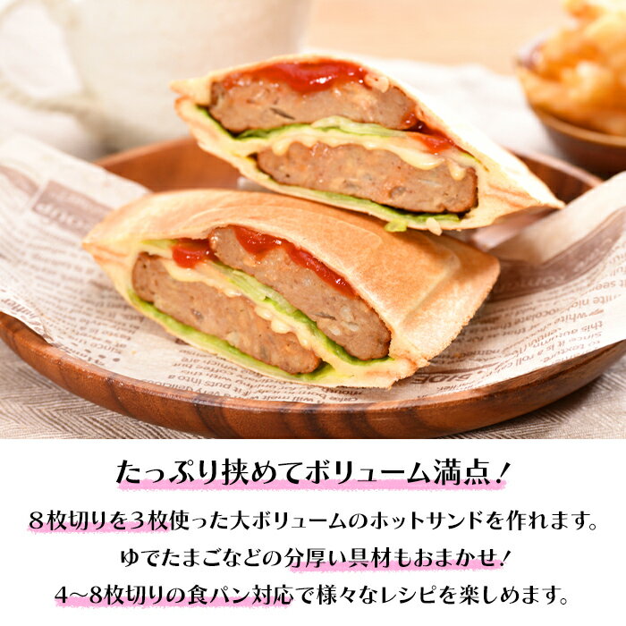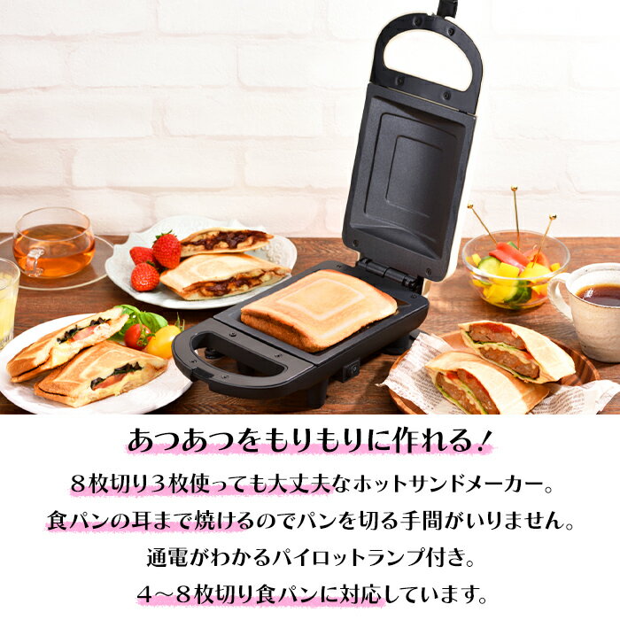 ----------------- 商品詳細 ----------------- サイズ(約):幅14.5×奥行30×高さ10.5cm 材質: [本体]フェノール樹脂 [プレート]アルミダイキャスト(フッ素樹脂塗装) 重量(約):1.3kg 電源:AC100V 50/60Hz 消費電力:420W 電源コードの長さ(約):1.4m 生産国:中国 ----------------- [商品の説明] 食パンの耳までそのまま焼けるホットサンドメーカー。 8枚切りの食パンを3枚使って、ボリューム感のあるホットサンドが作れます。 4~8枚切り食パンに対応。スイッチ1つで安全に操作できます。 通電状態がわかりやすいパイロットランプ付き。 毎日の朝食や軽食作りにぴったりのプレート固定式ホットサンドメーカーです。----------------- 商品詳細 ----------------- サイズ(約):幅14.5×奥行30×高さ10.5cm 材質: [本体]フェノール樹脂 [プレート]アルミダイキャスト(フッ素樹脂塗装) 重量(約):1.3kg 電源:AC100V 50/60Hz 消費電力:420W 電源コードの長さ(約):1.4m 生産国:中国 ----------------- [商品の説明] 食パンの耳までそのまま焼けるホットサンドメーカー。 8枚切りの食パンを3枚使って、ボリューム感のあるホットサンドが作れます。 4〜8枚切り食パンに対応。スイッチ1つで安全に操作できます。 通電状態がわかりやすいパイロットランプ付き。 毎日の朝食や軽食作りにぴったりのプレート固定式ホットサンドメーカーです。