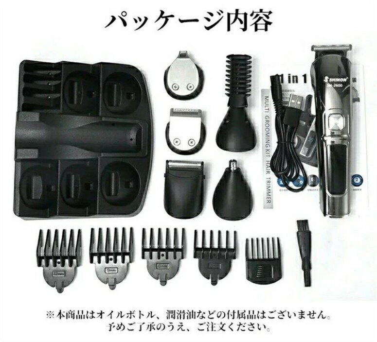 【材質】 ABS、金属 【色】 黒 【電源】 5W 【電圧】 100-240V 【充電時間】 1.5時間 【使用時間】 90分 【商品サイズ】 約16*3.8*4CM 【商品重量】 約134g 【防水レベル】 IPX7 【ご注意】 ※本商品はオイルボトル、潤滑油などの付属品はございません。予めご了承のうえ、ご注文ください。 【お薦めポイント】 6in1 6種のヘッドを変えるだけで、すべてはこれーつで処理できる この一台で、すべてを!! 髪、ヒゲ、もみあげ、鼻毛、耳毛、ボディーまで全身使える! 切れ味抜群&安全性 電動バリカンは優良なR型取り刃設計を採用し肝心な切れ味は素敵、刃の先端は良質なチタンとセラミックスで構成されて、サビなどの心配もなく切れ味の劣化しにくいので長持ちできます。 肌を傷めず、低騒音の稼動で小さな子供からお年寄りまで誰でも安心に使えます。 刈り長さ微調節 お好みにより、アタッチメントを付け替え、本体のダイヤルと合わせての段階の刈り高さ調節が可能、更に短くカットしたい時はアタッチメントを外すだけいいです。 簡単にお好みの髪の長さにカットできます十分です。敬老の日、父の日のギフトが最適です。 IPX7防水&超軽量 防水設計を採用、本体のヘッド部分を取り外して、水洗いで清潔可能、お手入れ簡単です。 バリカン機能だけではなく、髭剃り、ボディシェーバーの機能も備え、軽め設計で疲れにくい重さであり子供、家庭、理髪店、業務、出張用などの場合に適用します。 注:バリカン本体は全身防水ですが、バッテリーはダメです。だから洗う前に、バッテリーの蓋をしっかり締めてください。 充電式コードレス ヒゲトリマーは大容量バッテリーを内蔵し、コードが邪魔にならないコードレス、コンセント不要でどんな場所でも楽々ヘアカット!多人数でも大丈夫! 理髪店にも大活躍!