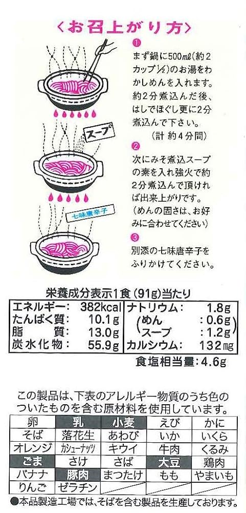 商品情報 商品の説明 商品紹介昭和41年発売以来、幅広い層のお客様に支持され続けています名古屋伝統の味「みそ煮込」をご家庭でお手軽に味わって頂ける即席めんです。厳選したうどん用粉を使用し、じっくり練り上げたコシのある油揚げめん。豆みそを100%使用した赤味噌仕立のコク深いみそ煮込スープです。風味の良い七味唐辛子付き。原材料・成分味付油揚げめん(小麦粉・ラード・植物油脂・食塩・みそ・砂糖)・粉末みそ・食塩・砂糖・でん粉・ 七味唐辛子・脱脂粉乳・粉末かつお節・酵母エキス・かつおエキス・調味料(アミノ酸等)・炭酸カルシウム・酸化防止剤(ビタミンE・ビタミンC)・(原材料の一部に、小麦、大豆、豚を含む)ご注意(免責)>必ずお読みくださいこの商品は当店の他の商品と同梱できません 主な仕様 内容量:91g×30個 原材料:油揚げめん(小麦粉、ラード、植物油脂、食塩、みそ)、粉末みそ、食塩、砂糖、粉あめ、七味唐辛子、脱脂粉乳、粉末かつお節、酵母エキス、調味料(アミノ酸等)、炭酸カルシウム、酸化防止剤(V.E、V.C)、(原材料の一部に豚を含む) 商品サイズ(高さ×奥行×幅):363mm×370mm×133mm