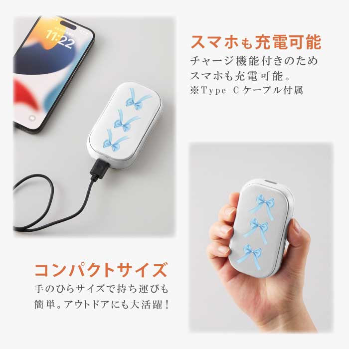 USBエコカイロ 充電カイロ 充電式 電気カイロ 電子カイロ カイロ かいろ モバイルバッテリー リボン りぼん 地雷系 量産 ブルー かわいい コンパクト 速暖 防寒グッズ ハンドウォーマー 通勤 通学 アウトドア 防災 2000mAh 繰り返し 使える あったか 送料無料