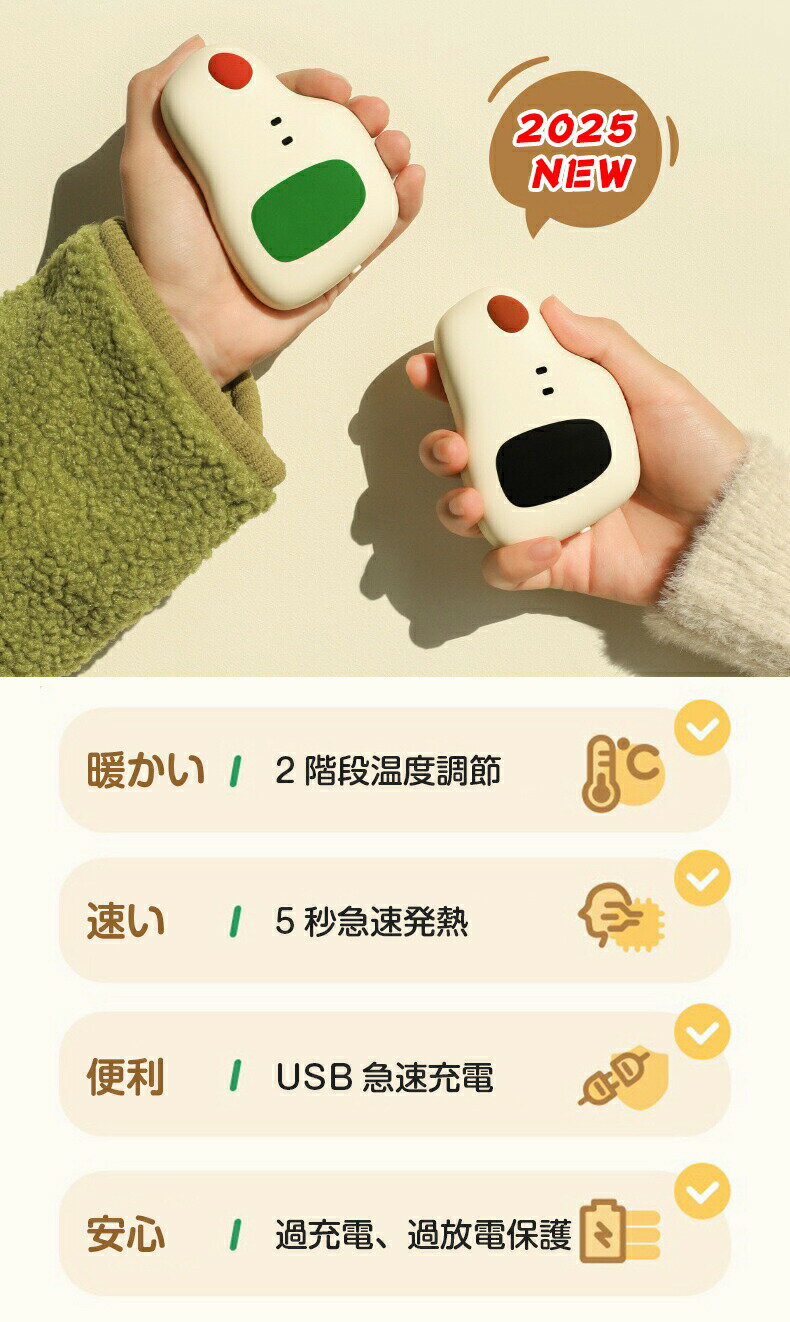 【2026年日本初上陸!新世代充電式カイロ】もう使い捨てカイロに頼る必要はありません。1日限りで捨ててしまうと、3ヶ月で約3,600円のコストに…。さらに、温度調節機能付きでシーンに合わせて快適に。充電すればくり返し使えるから、ゴミも出さずスマートに冬を楽しめます。お財布にも地球にもやさしい、この冬はもう手放せない!【5秒速暖2段温度調節】高い熱伝導率を誇るグラフェン素材を採用し、ボタンを押してわずか5秒で本体が温かくなります。カイロは、環境や体調に合わせて2段階の温度調節が可能です。1段階(40〜42℃)、2段階(45〜47℃)の中から、お好みの温度に設定できるため、どんな場面でも快適に過ごせます。寒さの厳しい冬に欠かせない一台です。【4800mAh大容量&冬を暖かく過ごせましょう】4800mAhの電池容量がありますので長時間の使用にも耐え、3〜5時間連続使用可能。(実際の使用時間は、環境や使用状況などにより異なる場合があります。)電気カイロの裏、表に2枚の発熱板が内蔵しており、両面が同時に発熱設計され、全方位的に両手を暖かめます。 寒い手足をしっかりと温めてくれます。【超軽量コンパクト携帯便利】電気カイロは約10×6×4cmの手のひらサイズ。握りやすさを追求した薄型デザインで、ポケットやバッグにすっきり収まります。小さなお子様や女性でも使いやすく、指先までしっかり温めます。寒い朝の通勤や通学、厳寒地、屋外、学校、キャンプ、雪山、登山、野外ライブ、釣り、スキー、スノボ、雪遊びなど、寒い日の外出のお守り代わりに活躍します。冬の外出を快適にする頼れるアイテムです。【多重な安全保護】高い品質基準を保証するために、すべての製品は、開発段階から量産まで、専門的な経験によってサポートされ、徹底的にテストされています。充電カイロはPSE認証済みで、過熱防止や過充電防止などの6つ安全機能を搭載しています。過電流過充電による故障や、温度の上がりすぎを心配する必要はありません。