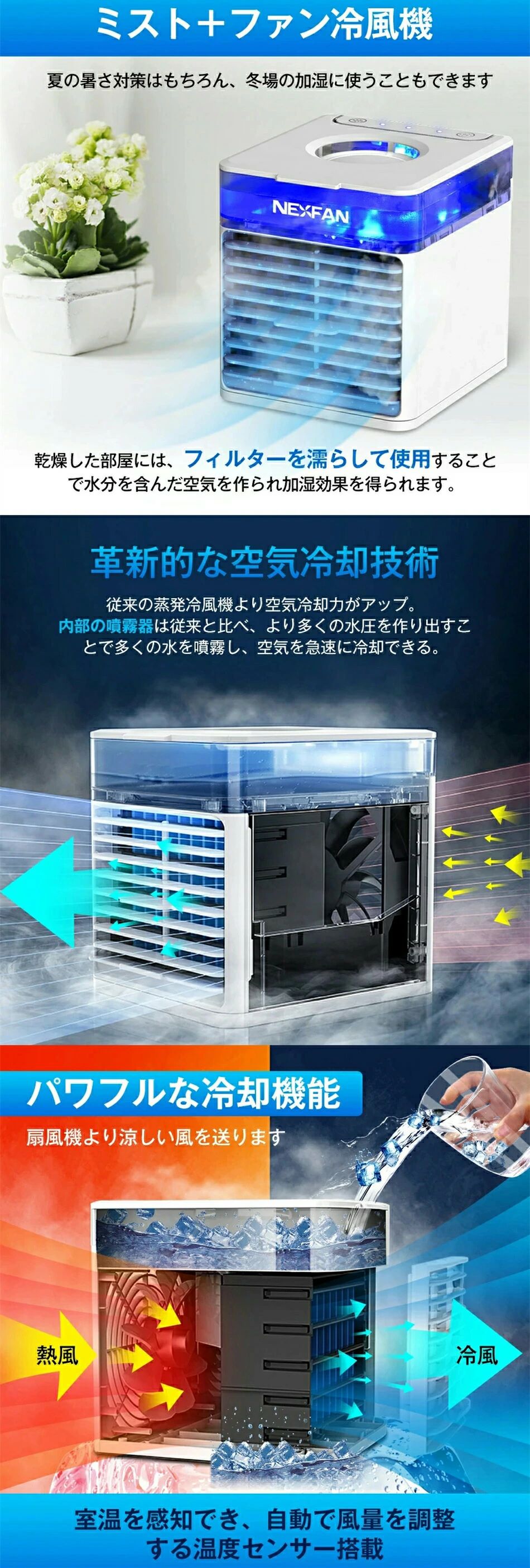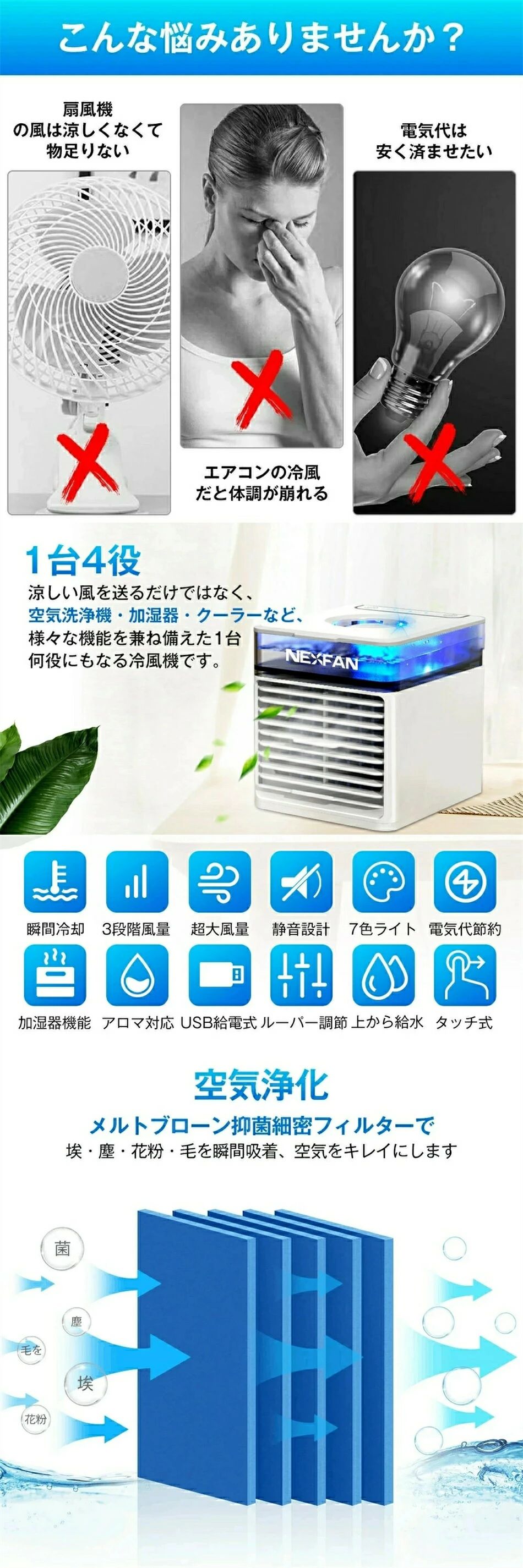 卓上冷風機&1台多役★冷却?加湿?空気浄化?夜間7色ライト,4in1機能を同時に備え卓上冷風機です。★風量は弱?中?強で3段階調節可能です。クーラーより優しい、扇風機より涼しい。★フィルターを濡らして使用することで水分を含んだ空気を作り加湿効果あります。★冷風扇として、空気を加湿し、自然の涼風を感じながら乾燥を防ぎ、加湿?冷却効果が期待でき、暑さ、熱中症対策グッズ。ミスト機能&潤う冷風★水が蒸発する時の気化熱で、涼しい風を発生させるミスト冷風機です。★室温を感知でき、自動で風量を調整する温度センサー搭載しております。★冷風扇の風がミストを蒸発させる際、周囲の熱を吸収してその場の温度を下げてくれます。★風による涼しさだけではなく、実際の気温まで下げてくれるのはミストファンならではの効果です。水洗可能フィルター&安全装置内蔵★湿ったフィルターに空気が通し、クリーンで爽やかな冷風で安心して使えます。★ミニクーラーの中に電源オフ保護機能も搭載し、5時間連続すると自動的に電源を切断します。★冷風扇のフィルターは上質の素材で作るので丸洗いOK、付着した汚れを取り除いて、清潔で衛生的な状態に保ちます。USB給電&電気代節約★ミニ冷風機はUSB給電式なのでアダプターやパソコンやモバイルバッテリーなどで給電できます。★省エネ、環境にも優しいです。エアコンよりも電気代が断然おトク、電気代約96%OFFになります。★エアコンとうまく使い分け?併用すれば、夏場の電気代節約が目指せます。空気清浄&アロマ対応★卓上冷風機の除菌フィルターは、水タンクの汚染を防ぐだけではありません。★吸い込んだ空気を浄化して排出しますので、細菌が引き起こすいやな臭いを取り除くことができます。★LEDライトは7色あり、気分に合わせてお選びいただけます。リラックスしたい時は、アロマオイルを水タンクにプラスすれば、ディフューザー代わりに。お気に入りの香りと心地よい風に包まれておやすみください。3ケ月保証期間★保証期間:お買い上げ日から90日★初期不良、自然故障等、通常使用にかける不具合に保証対応させていただきます。※ご注文番号をご用意の上お問い合わせ頂きますとスムーズになご案内が可能です。ご協力のほどよろしくお願い致します。関連キーワード冷風機 卓上 冷風扇 ミニ 卓上扇風機 携帯扇風機 ミニ扇風機 卓上冷風機 卓上冷風扇 加湿器 卓上加湿器 空気清浄機 卓上空気清浄機 アロマディフューザー 卓上アロマディフューザー 静音 USB ポータブルクーラー ポータブル エアコン 扇風器 冷風器 小型卓上 クーラー おすすめ 持ち運び エアコン ミニクーラー 潤う クーラーレコ 冷風扇風機 パーソナルクーラー 持ち運び コンパクト 卓上冷風扇 車 オフィス 涼しい 車 ミニ ポータブル 風量調整 リモート テレワーク アウトドア 在宅 勤務 グッズ 在宅ワーク 便利グッズ ミストファン ミニクーラー 卓上クーラー ポータブルエアコン テレワーク 氷 保冷剤 ZIP キテルネ 小型 クーラー 冷房 上から給水 日本語説明書付き 送料無料 敬老の日 ギフト 誕生日 ギフト 贈り物 おすすめ 父の日 母の日 敬老の日 恋人 友人 誕生日 プレゼント ギフト卓上冷風機&1台多役★冷却?加湿?空気浄化?夜間7色ライト,4in1機能を同時に備え卓上冷風機です。★風量は弱?中?強で3段階調節可能です。クーラーより優しい、扇風機より涼しい。★フィルターを濡らして使用することで水分を含んだ空気を作り加湿効果あります。★冷風扇として、空気を加湿し、自然の涼風を感じながら乾燥を防ぎ、加湿?冷却効果が期待でき、暑さ、熱中症対策グッズ。ミスト機能&潤う冷風★水が蒸発する時の気化熱で、涼しい風を発生させるミスト冷風機です。★室温を感知でき、自動で風量を調整する温度センサー搭載しております。★冷風扇の風がミストを蒸発させる際、周囲の熱を吸収してその場の温度を下げてくれます。★風による涼しさだけではなく、実際の気温まで下げてくれるのはミストファンならではの効果です。水洗可能フィルター&安全装置内蔵★湿ったフィルターに空気が通し、クリーンで爽やかな冷風で安心して使えます。★ミニクーラーの中に電源オフ保護機能も搭載し、5時間連続すると自動的に電源を切断します。★冷風扇のフィルターは上質の素材で作るので丸洗いOK、付着した汚れを取り除いて、清潔で衛生的な状態に保ちます。USB給電&電気代節約★ミニ冷風機はUSB給電式なのでアダプターやパソコンやモバイルバッテリーなどで給電できます。★省エネ、環境にも優しいです。エアコンよりも電気代が断然おトク、電気代約96%OFFになります。★エアコンとうまく使い分け?併用すれば、夏場の電気代節約が目指せます。空気清浄&アロマ対応★卓上冷風機の除菌フィルターは、水タンクの汚染を防ぐだけではありません。★吸い込んだ空気を浄化して排出しますので、細菌が引き起こすいやな臭いを取り除くことができます。★LEDライト
