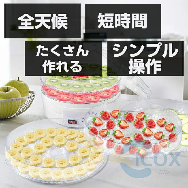商品情報【天候に左右されず たっぷり作れる】お客様からのお声も取り入れ、よりシンプルに、より使いやすくなりました。 天日干しと比較して天候に影響されることなく、 家の中で短時間、かつ沢山効率よく作ることができます。 食材を切って乗せたら温度設定してスイッチ1つ。 あとは待つだけで自家製ドライフードができあがり。 干し芋や切り干し大根など、古くから愛されているドライフード。 フードドライヤーを取り入れることで食生活が豊かになり、楽しみが広がります。【均一に温風が当たり ムラなく乾燥】トレイが回転するため温風が満遍なく行き渡り、乾燥の度合いにムラが出来にくいのがポイントです。 短時間で隅々までしっかりと乾燥させたい方にお薦めです。【水洗いOK】フタとトレイは丸洗いでき清潔にお使いいただけます。 ※本体は水洗いが出来ません。 汚れた場合は固く絞った濡れふきんなどで汚れを拭いてご使用ください。【簡単操作プロセス】このアイテムは、1つの操作ボタンを使用して簡単に調理できるように設計されています。ワンクリックで脱水を選択するだけです。【取り外し可能なトレイ】取り外し可能な積み重ね可能な食品トレイまたは乾燥トレイも装備されています。このビデオドライヤーは必要な容量に簡単に変えることができ、これらのトレイは脱水機を使用せずに食品を乾燥させるためにも使用できます。トレイは取り外し可能で、脱水機を含めて簡単に掃除できます。【ドライフルーツ】りんご、キウイ、いちご、バナナ、オレンジなどドライフルーツの定番から、パイナップル、梨、イチジク、さくらんぼなど、市販ではなかなか見かけない珍しいフルーツも自家製で作れます。 そのまま食べるだけではなく、ヨーグルトに入れたり、お菓子やパン作りに使ったり、色々と活用頂けます。【管理栄養士推奨】食品から水分を蒸発させることで細菌・カビからの腐敗を防ぎ常温でも長期間の保存が可能になりさらに水分が飛ぶことでエネルギーやうまみが凝縮されます。フードドライヤーと天日干しを取り入れれば栄養価の増加が期待できるものもあり子どもやペットのための無添加な」おやつ作りにびったりです。ドライ(乾燥食品)を自分で作るとなると大変で中々作る機会はないと思いますがフードドライヤーがあれば簡単に誰でも作ることが出来るので栄養面やフードロスを気にする方には」最適な商品だと思います。メーカー希望小売価格はメーカーサイトに基づいて掲載していますメーカー希望小売価格はメーカーサイトに基づいて掲載していますメーカー希望小売価格はメーカーサイトに基づいて掲載しています【~限定★ポイント10倍】フードドライヤー 食品乾燥機 回転式 プロ電気食品脱水機 フードドライヤー ドライフルーツメーカー 栄養の損失なし 大容量 5層 7層 8層 ステンレス製 35℃〜70℃温度設定 高効率360°熱風循環 自宅 簡単 家庭用 業務用 発酵食品 送料無料 食品乾燥機 野菜/果物/肉/魚/間食など乾燥 発酵食品 ドライフルーツ ドライフード 専用レシピ フードドライヤー 干小魚 花茶 ペット用おやつ 干し肉 草薬などの製作イ ドライフードは魅力がたくさん【Point1】うまみ&栄養価凝縮 食材の持つうまみ成分や香りが凝縮されます。 また乾燥することで栄養価が高まり、健康面での効能も注目されています。【Point2】長期保存が可能 長期保存できるため、冷蔵庫に余らせてしまいがちな食材も無駄なく利用することができ、フードロスの削減にも。【Point3】軽量・省スペース 乾燥させることで本来食材が持っている水分がなくなり、軽く小さくなります。 収納性が上がり持ち運びにも便利です。【Point4】保存料や着色料を含まず(食材を除く)、あんしん・あんぜん。 お子様やペットのための手作りおやつにも。この脱水機は、食品の保存に温度制御を使用します。悪名高いビーフジャーキーのように肉を脱水して保存できます。果物、野菜を脱水し、ポテトチップスやケールチップスなどを作って、オーガニックのヘルシースナックを製造しています。 5